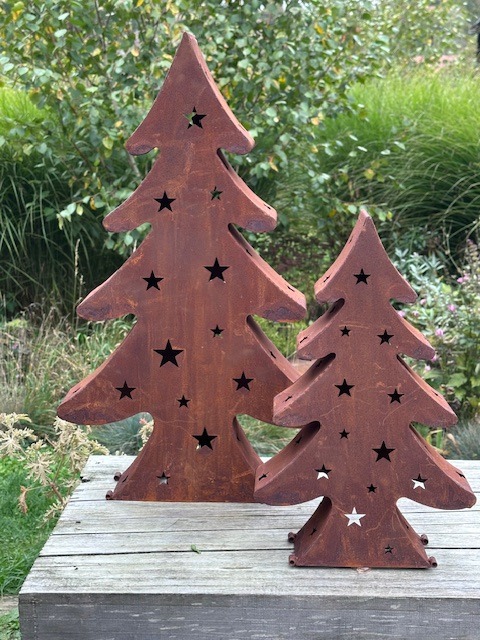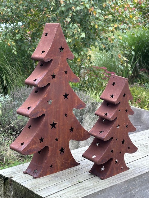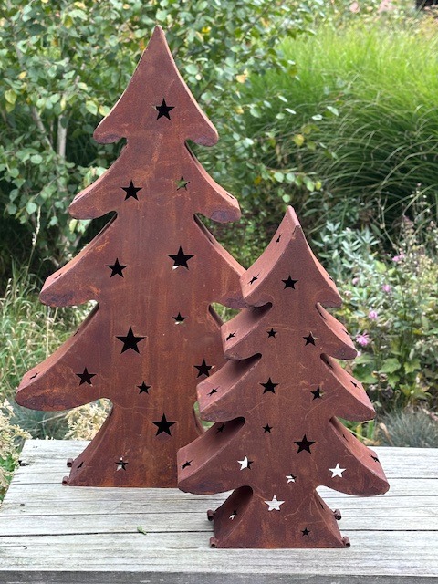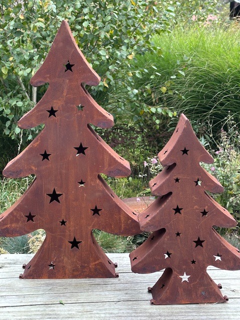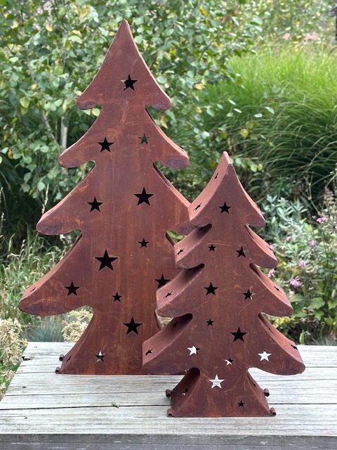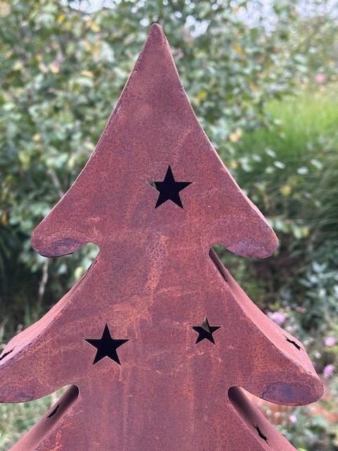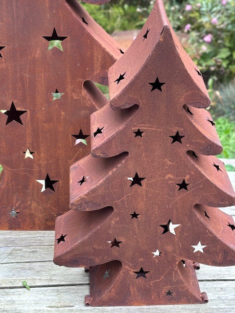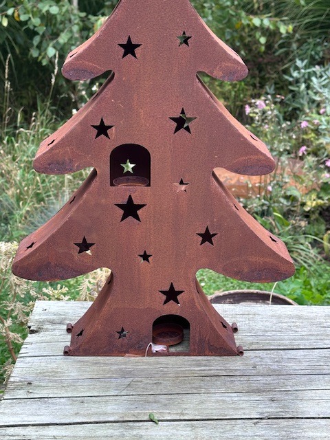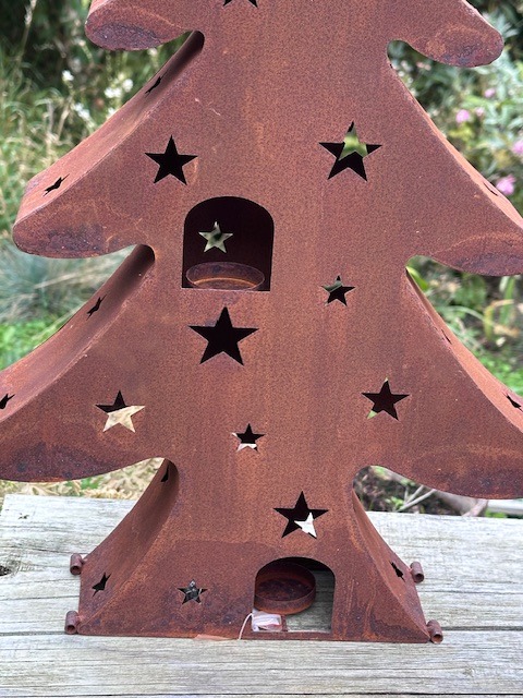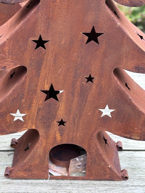 Extra velký a krásný kovový stromek z kovu Corten v rezavé barvě. Ze zadní části je otvor na svíčku, stromek může sloužit i jako lucerna.