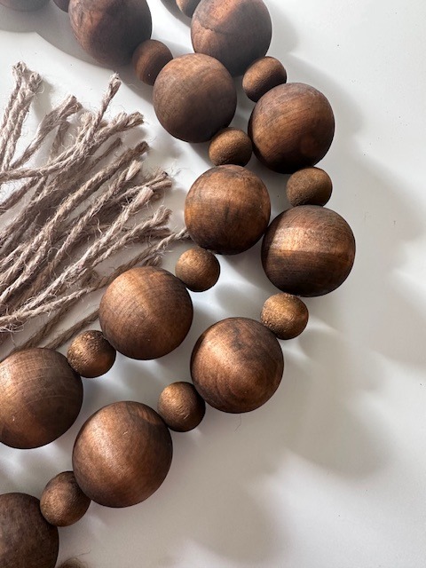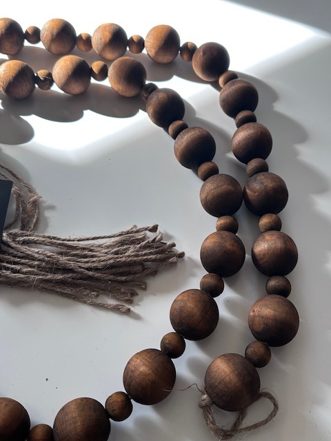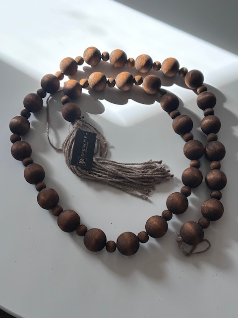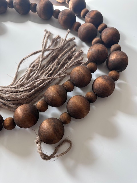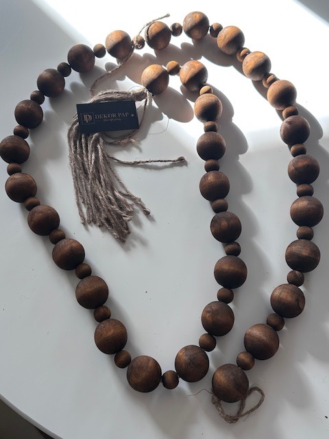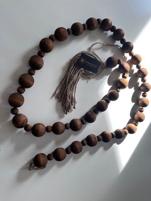 Řetěz z dřevěných kuliček o průměru 4 a 2 cm v tmavě hnědé barvě tropického dřeva na jutovém provazu , zakončený ozdobným střapcem na jedné straně. krásná a originální dekorace v nordic stylu.