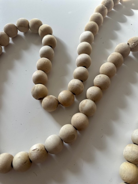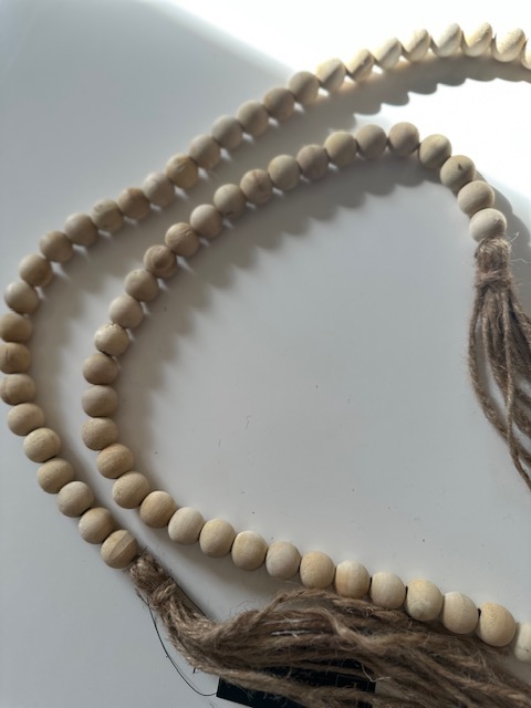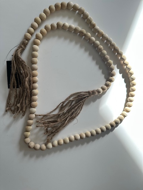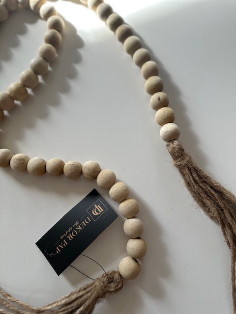 Řetěz z dřevěných kuliček o průměru 2 cm v přírodní barvě na jutovém provazu , zakončený ozdobným střapcem na obou stranách . Krásná a originální dekorace v nordic stylu.