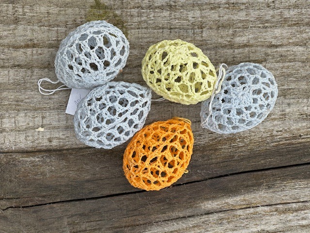 Světle žluté háčkované vajíčko, pevné, nepromáčknutelné kostrukce. Vajíčko je s provázkovým očkem vhodné k zavěšení a velikonoční dekoraci.