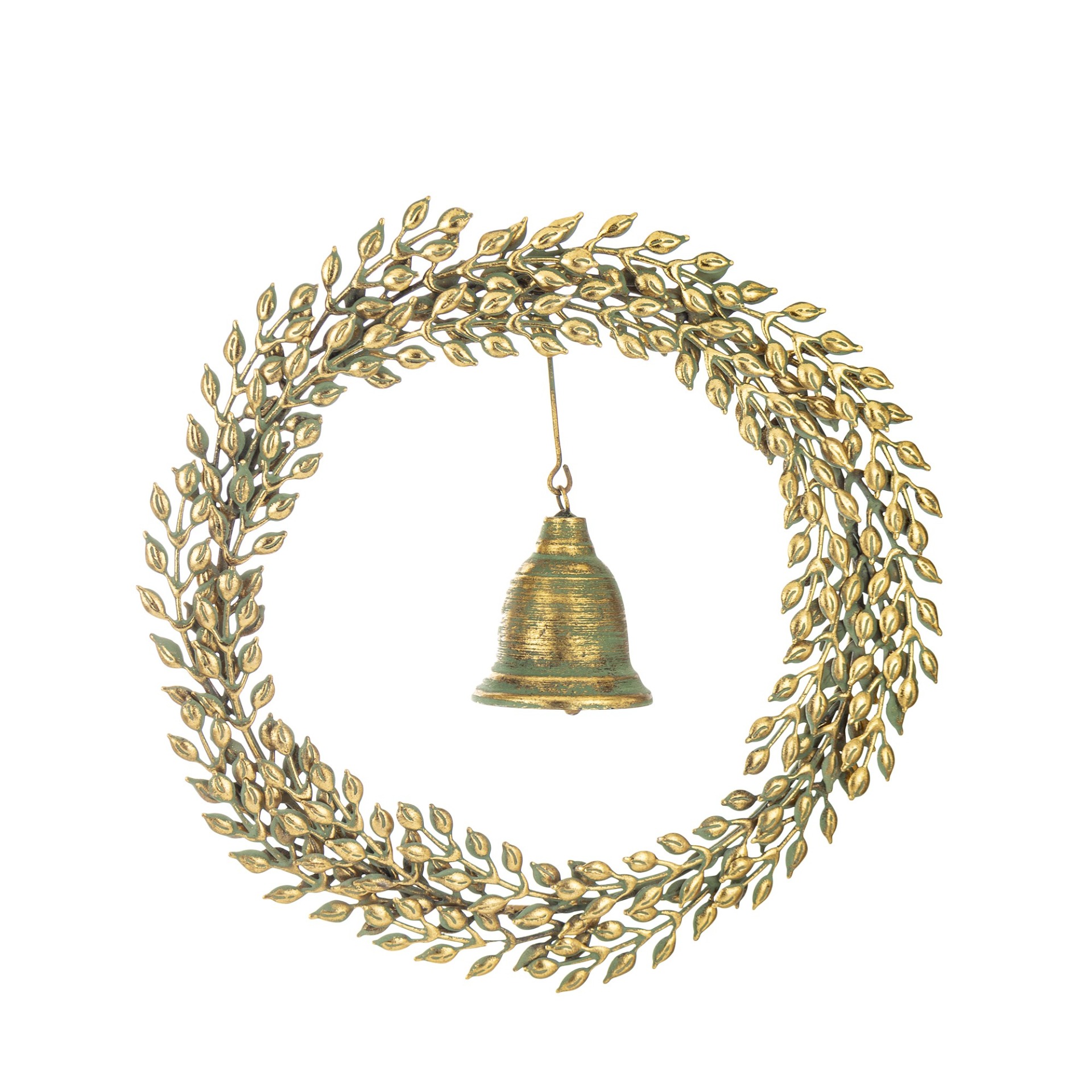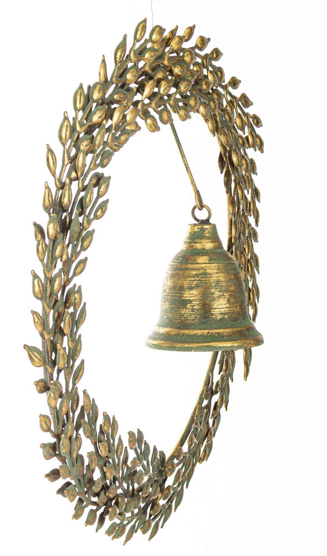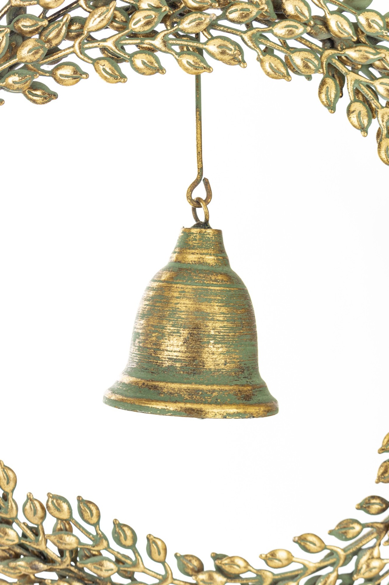 Extra velký kovový věnec o průměru 45 cm se zavěšeným zvonkem s patinou.