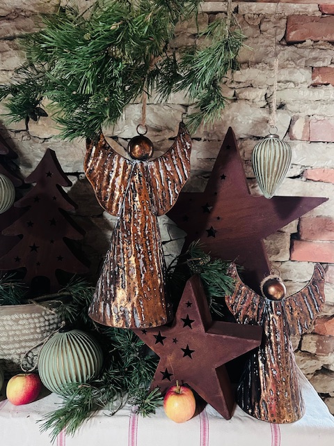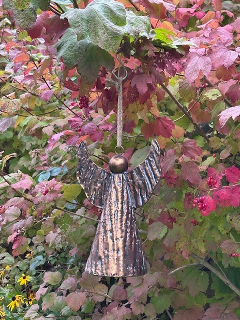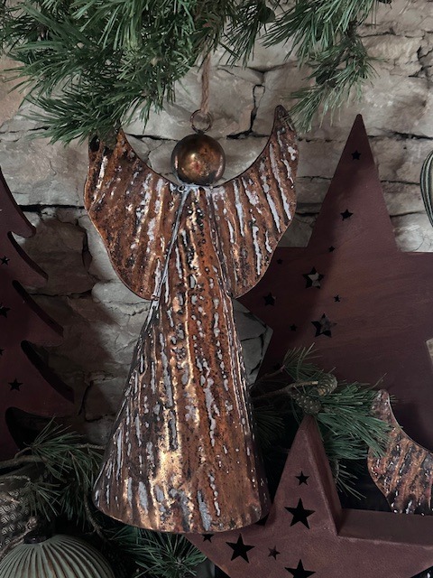 Velký kovový anděl - zvonek , v měděné barvě s patinou k zavěšení na jutovém provázku. Krásná dekorace pro milovníky andělů nejen pro vánoční čas.