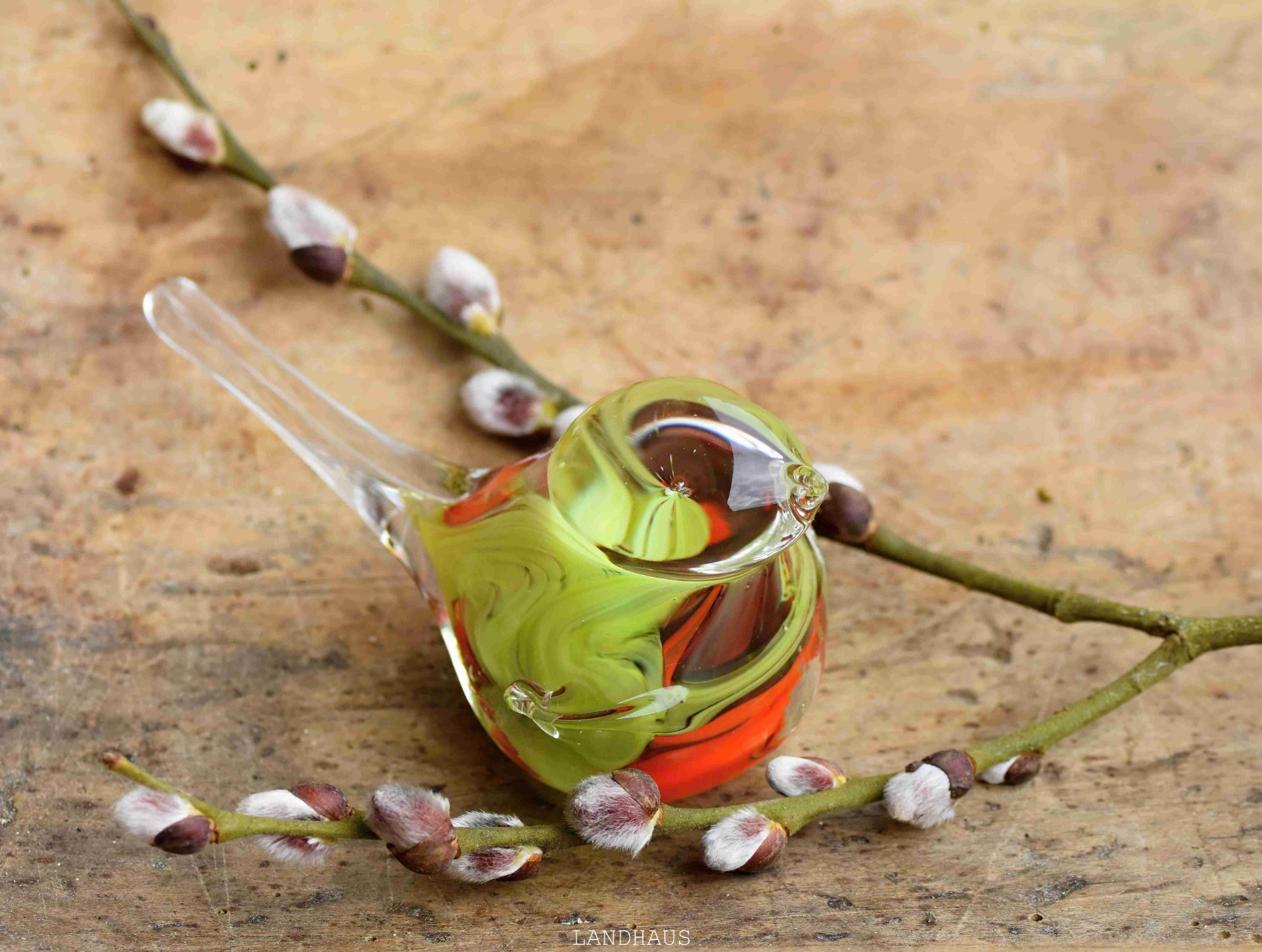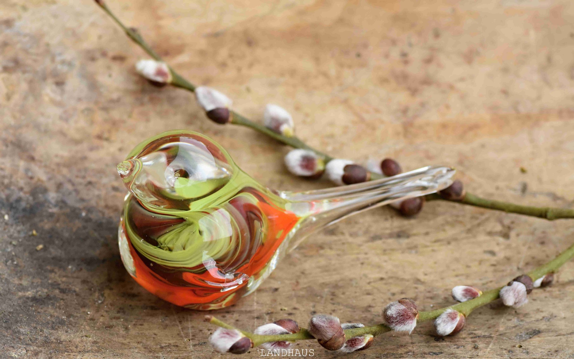 Ručně foukaný ptáček z hutního skla. Nádherná dekorace nejen na jaro, může sloužit i jako těžítko i celoročně jako stylová dekorace. Hodí se do každého interiéru.