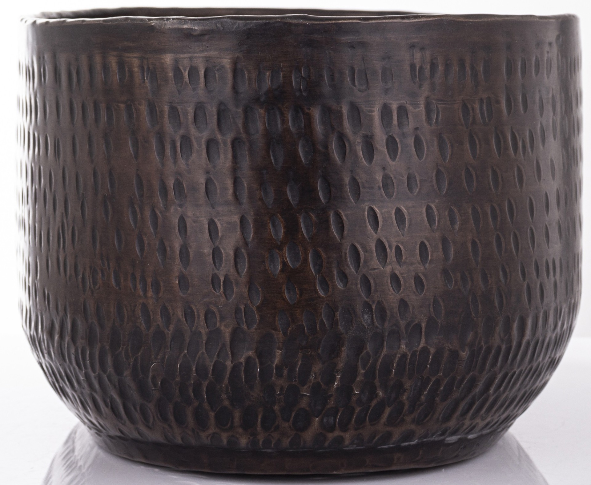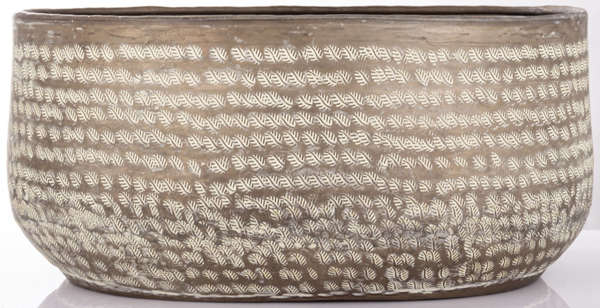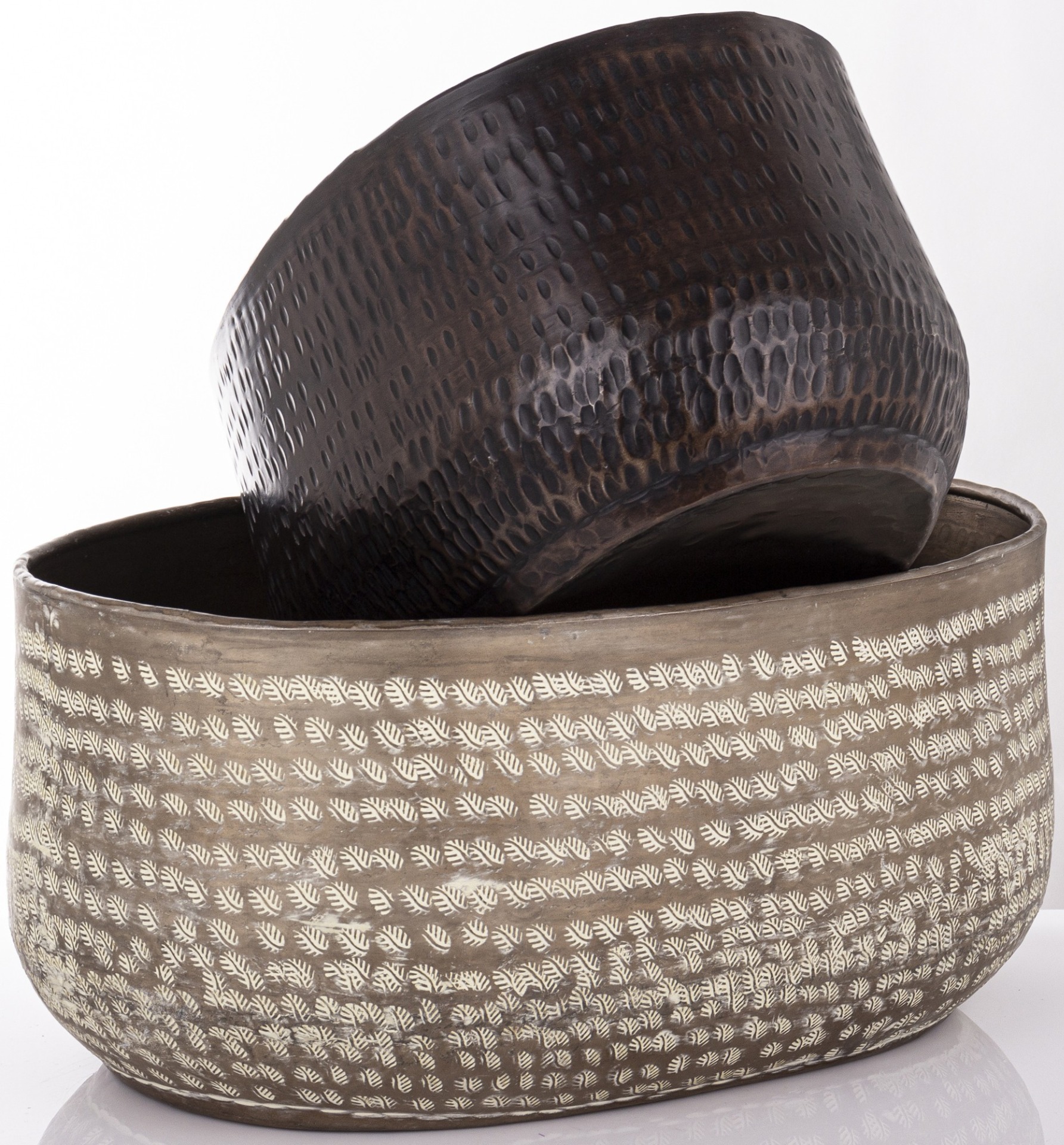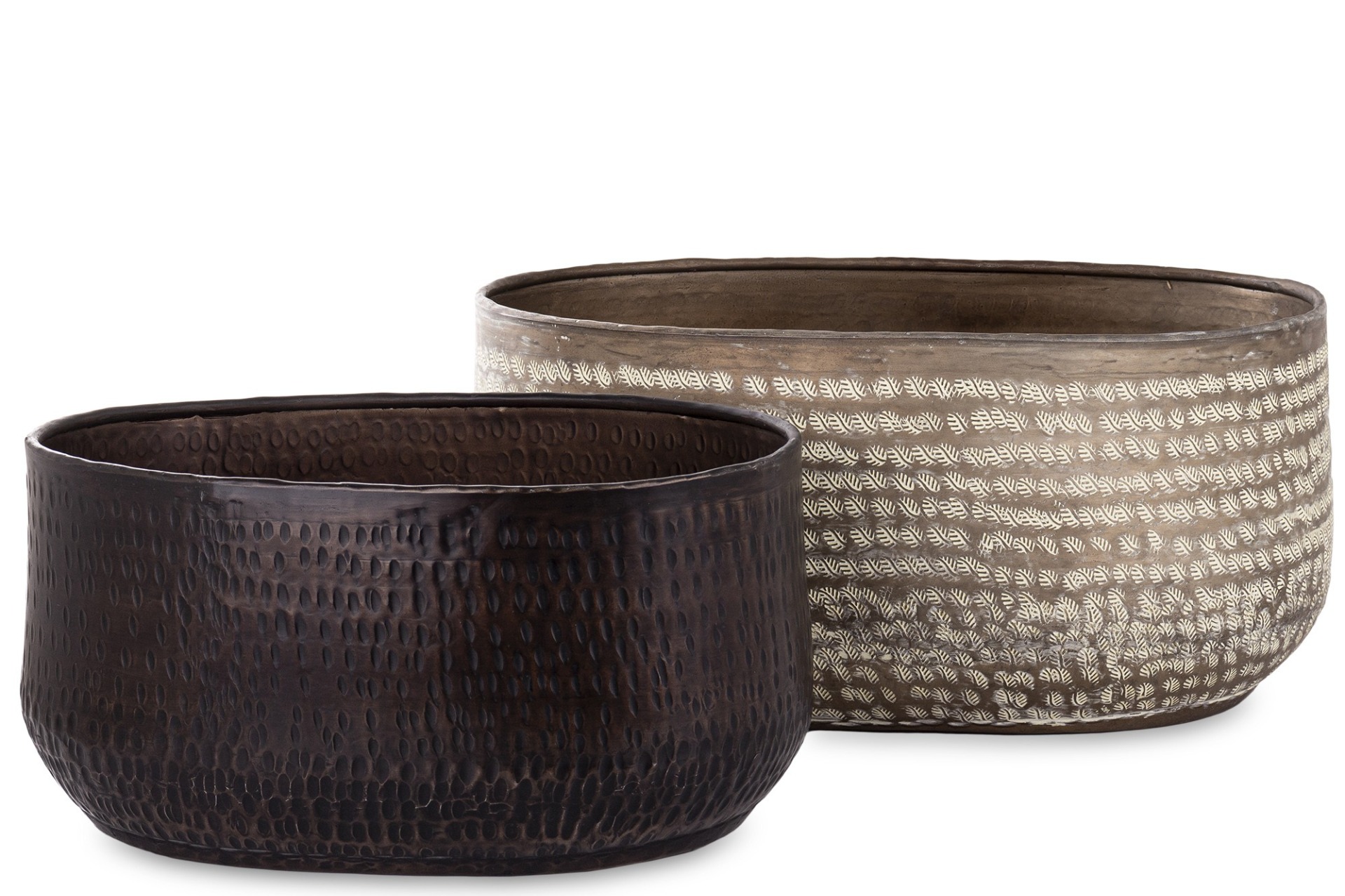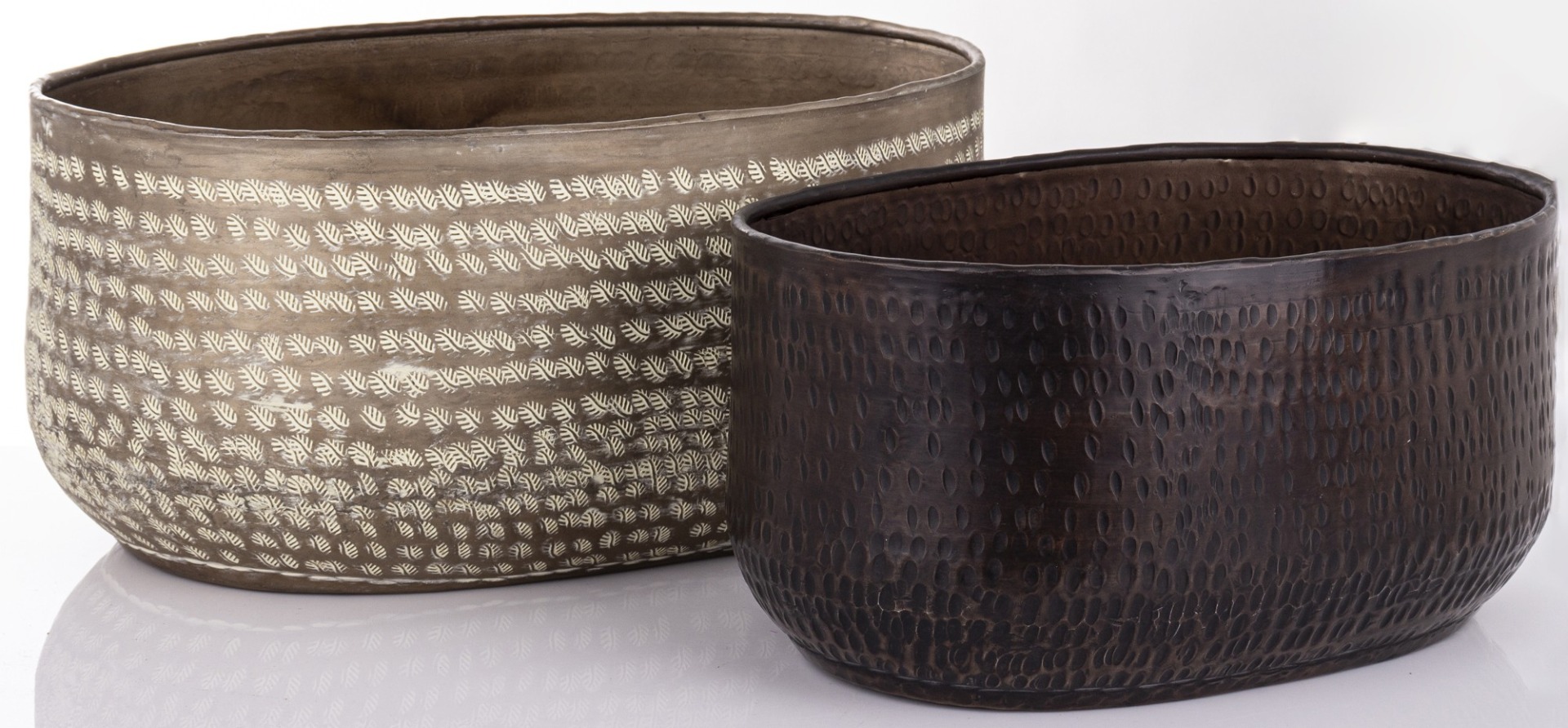 Sada 2 kovových květináčů-truhlíků, v navzájem ladících tonech měděné, zlaté a béžové. Květináče s plastickým vzorem.