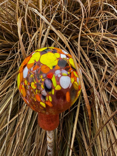 Menší koule z hutního skla k zahradní i interiérové dekoraci. Vhodná i jako zápich do záhonu, do truhlíků, na plot apod. Dodává se samostatně, bez tyčky. Tradiční ruční česká výroba, každý kus originál.