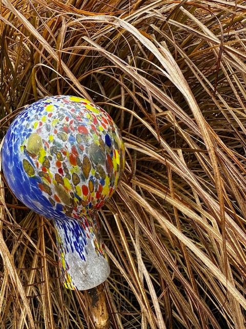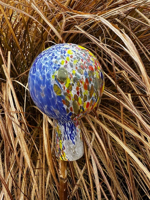Menší koule z hutního skla k zahradní i interiérové dekoraci. Vhodná i jako zápich do záhonu, do truhlíků, na plot apod. Dodává se samostatně, bez tyčky. Tradiční ruční česká výroba, každý kus originál.