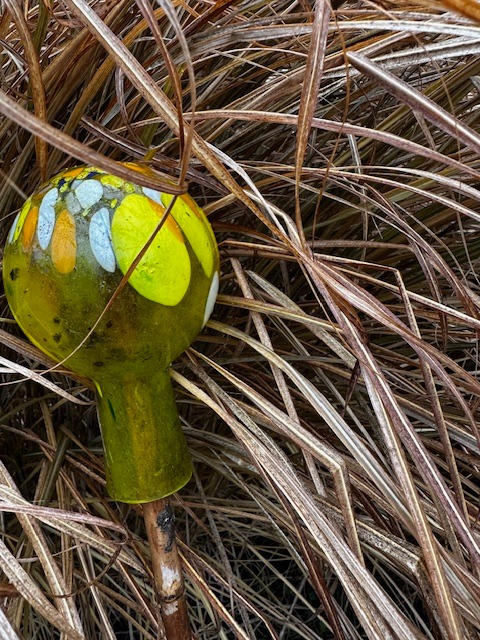 Menší koule z hutního skla k zahradní i interiérové dekoraci. Vhodná i jako zápich do záhonu, do truhlíků, na plot apod. Dodává se samostatně, bez tyčky. Tradiční ruční česká výroba, každý kus originál.