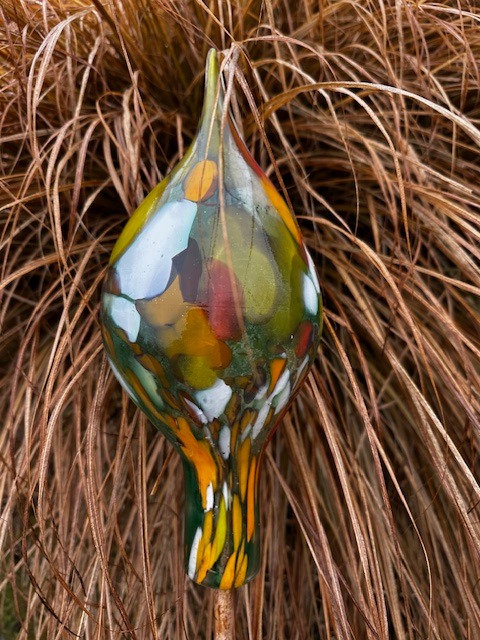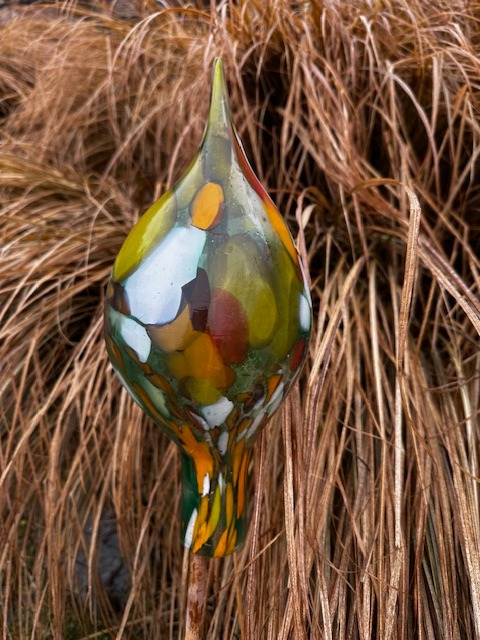 Středně velký zápich podlouhlý z hutního skla k zahradní i interiérové dekoraci. Vhodná i jako zápich do záhonu, do truhlíků, na plot apod. Dodává se samostatně, bez tyčky. Tradiční ruční česká výroba, každý kus originál.