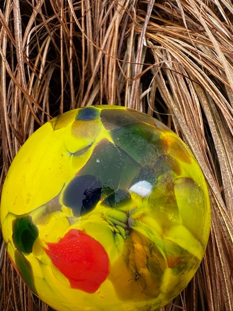 Středně velká koule z hutního skla k zahradní i interiérové dekoraci. Vhodná i jako zápich do záhonu, do truhlíků, na plot apod. Dodává se samostatně, bez tyčky. Tradiční ruční česká výroba, každý kus originál.