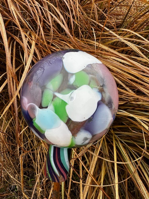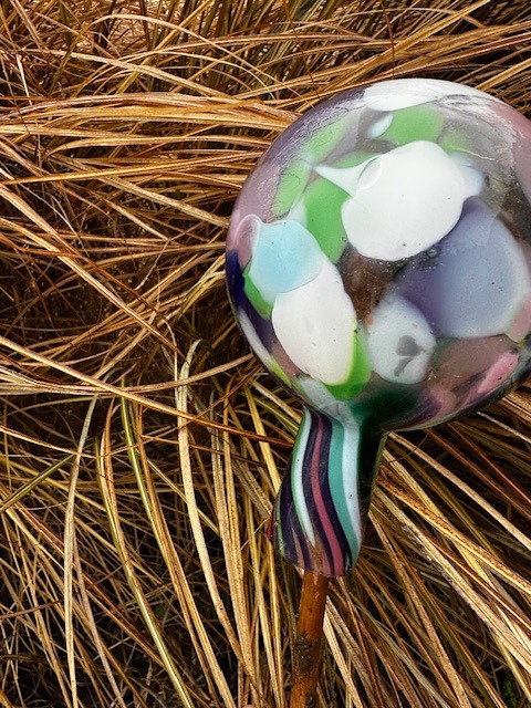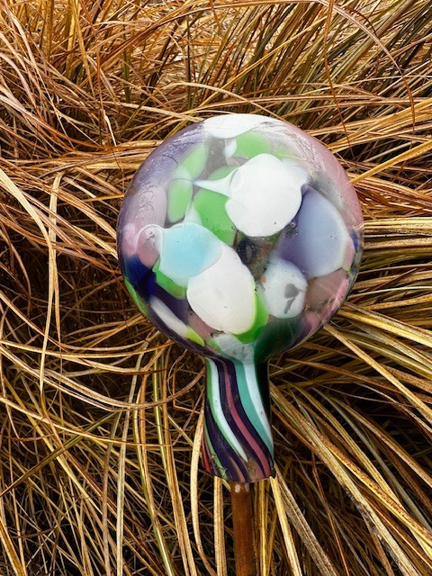 Středně velká koule z hutního skla k zahradní i interiérové dekoraci. Vhodná i jako zápich do záhonu, do truhlíků, na plot apod. Dodává se samostatně, bez tyčky. Tradiční ruční česká výroba, každý kus originál.
