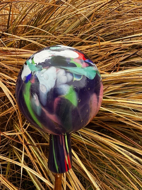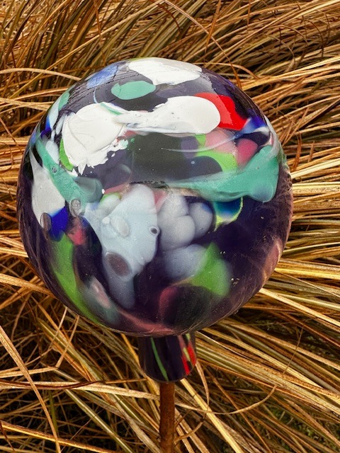 Středně velká koule z hutního skla k zahradní i interiérové dekoraci. Vhodná i jako zápich do záhonu, do truhlíků, na plot apod. Dodává se samostatně, bez tyčky. Tradiční ruční česká výroba, každý kus originál.