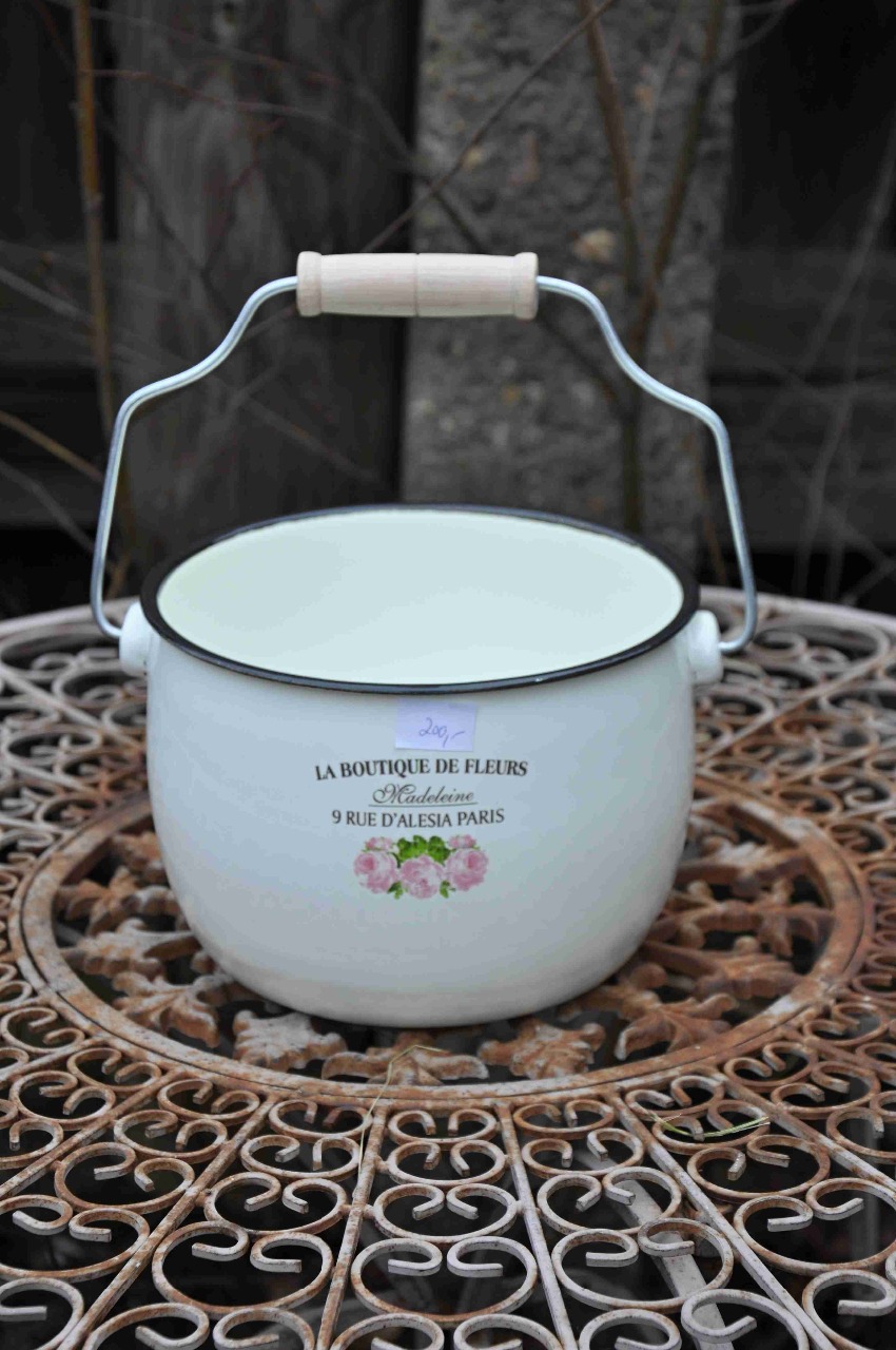 Smaltovaný květináč s odnímatelným i odklápěcím kovovým uchem s dřevěným madlem. Krásná interiérová i venkovní dekorace.