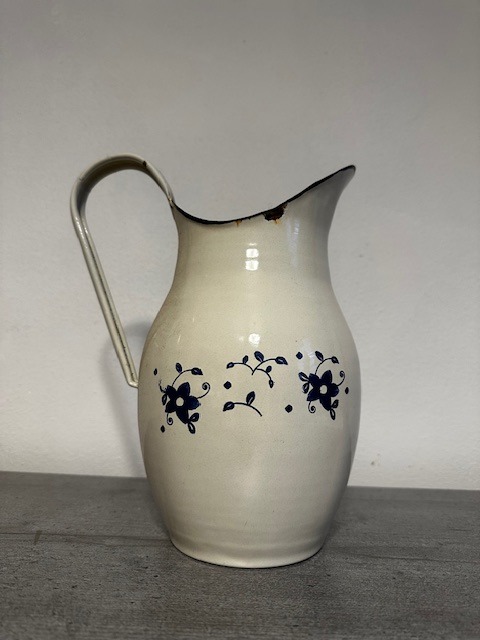 Smaltovaný velký džbán bílé barvy s modrými květinami.