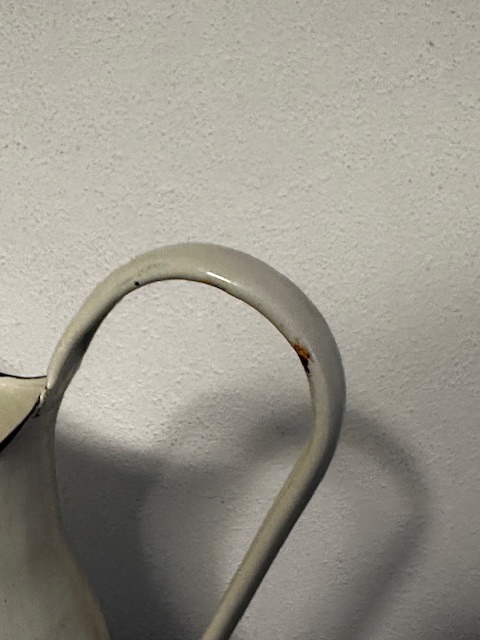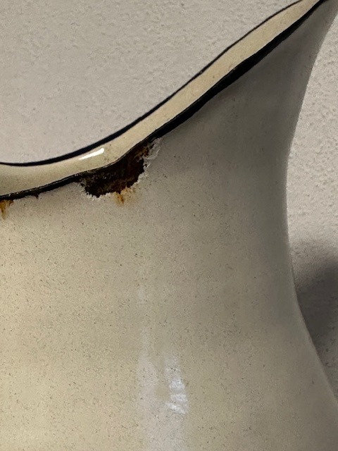 Džbán je nový, nepoužitý, bohužel přišel poškozený přepravou , má otluky na horní hraně, kde se tvoří rez, vše nafoceno.
