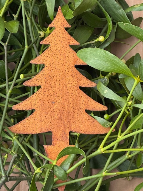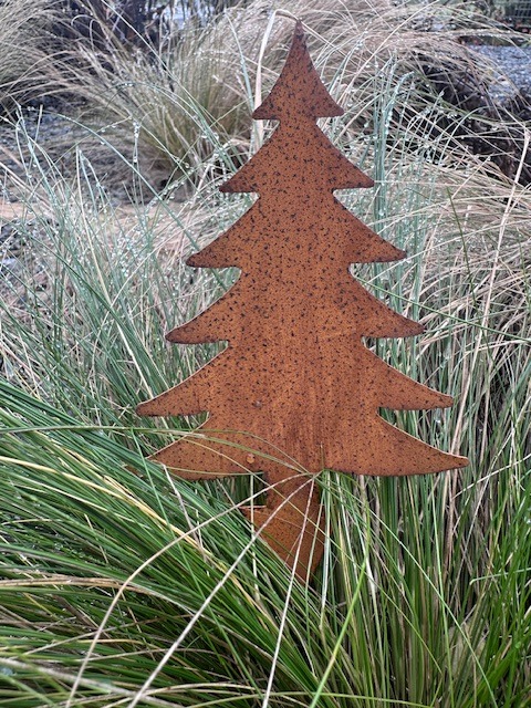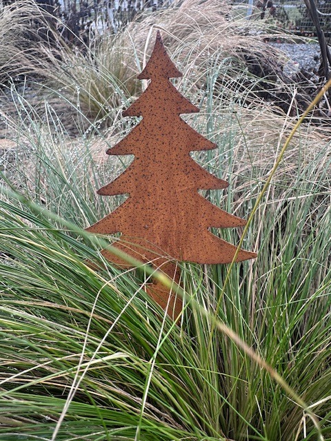 Zápich do květináčů, truhlíků, věnců, svícnů a dalších dekorací. Ve tvaru stromku z přirozeně rezavé cortenové oceli.