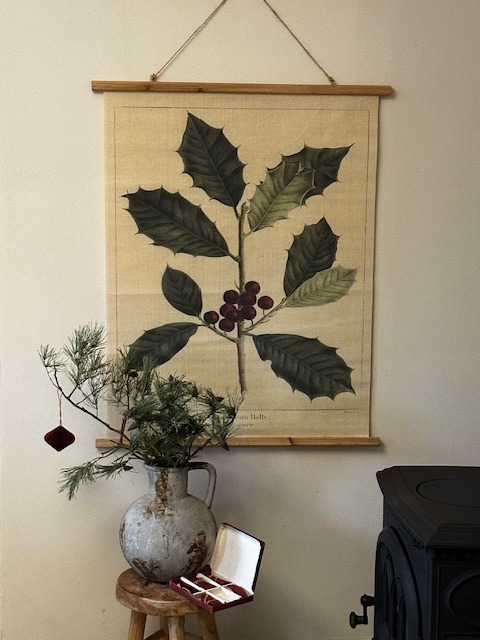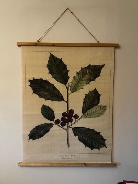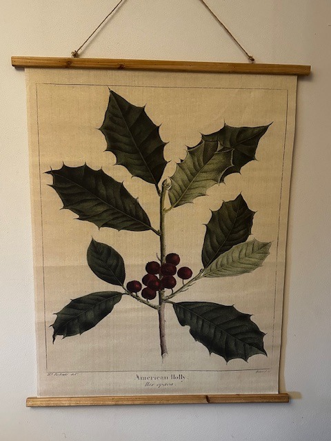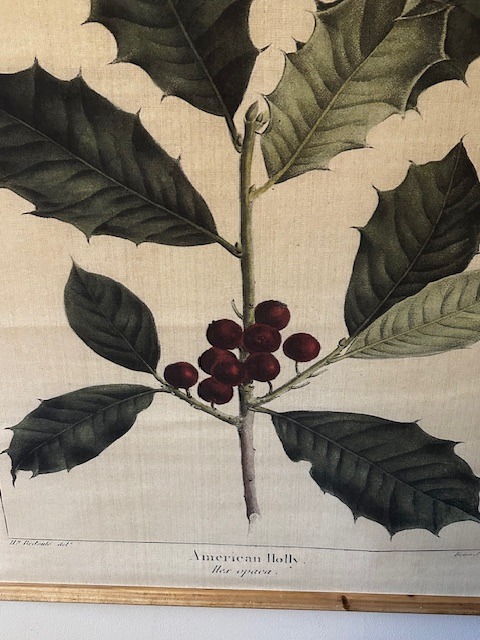 Velký textilní obraz s motivem cesmíny, dle vzoru starých herbářů ve vintage stylu. Dřevěné lišty , jutový provázek k zavěšení.