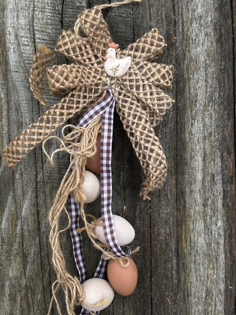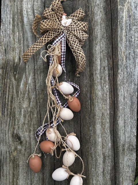Krásná velikonoční girlanda, základ tvoří jutový provázek, jutová mašle a vajíčka v přírodních barvách . Hodí se na vchodové dveře jako ekvivalent klasického věnce.