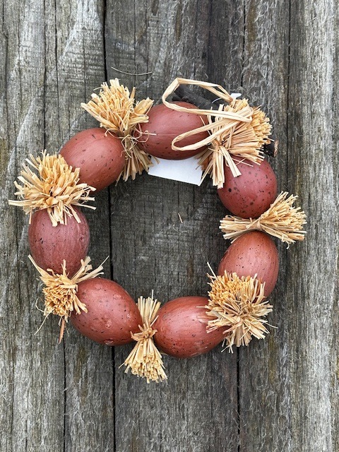 Velikonoční věnec ze 7mi vajíček a slaměných ozdob na drátku. Se dřívkem a slaměným okem k zavěšení například na dveře ši na stěnu.
