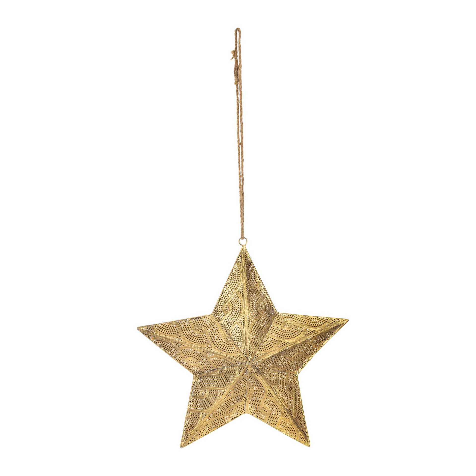 Velká kovová hvězda k zavěšení. Hvězda je plastická, oboustranná z kovu s krajkovým dekorem na jutovém provázku.