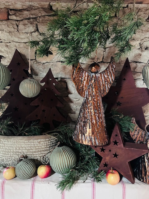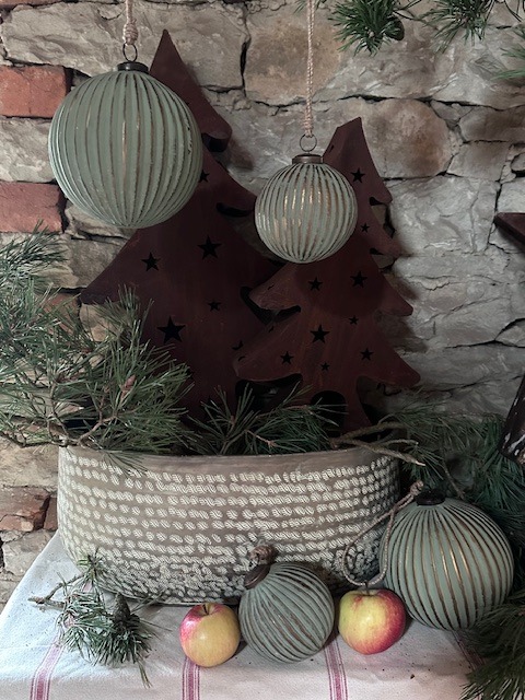 Masivní koule ve vintage stylu s patinou, v barvách zelená-hnědá-zlatá , na jutovém provázku.