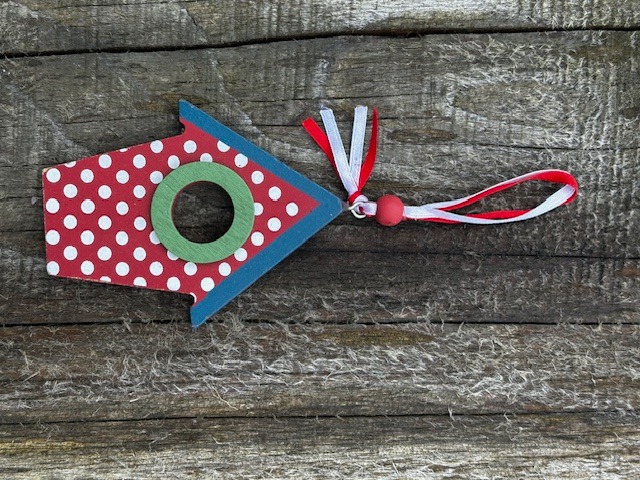 Krásná dekorace k zavěšení ve tvaru ptačí budky na stužce pro zavěšení.